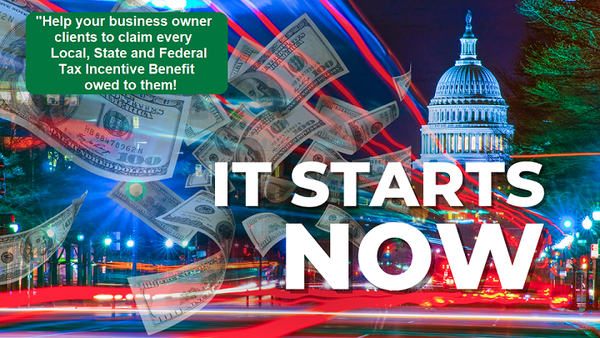 It Starts NOW that you have the ability to help your business owner clients take advantage of every Local, State and Federal Tax Incentive Benefit to increase their revenue by decreasing their tax liability. You have the opportunity to differentiate your firm by offering this amazing service.